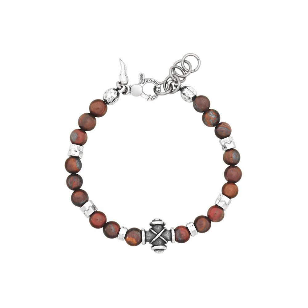 Questo modello alterna le calde sfumature delle pietre occhio di toro a una lavorazione centrale raffigurante una croce.