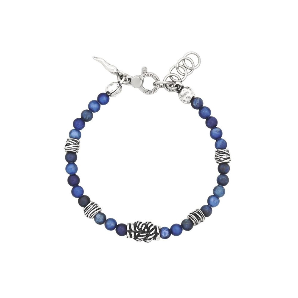 Questo modello accosta le sfumature blu della sodalite a una lavorazione centrale che raffigura un nodo di ispirazione navale.