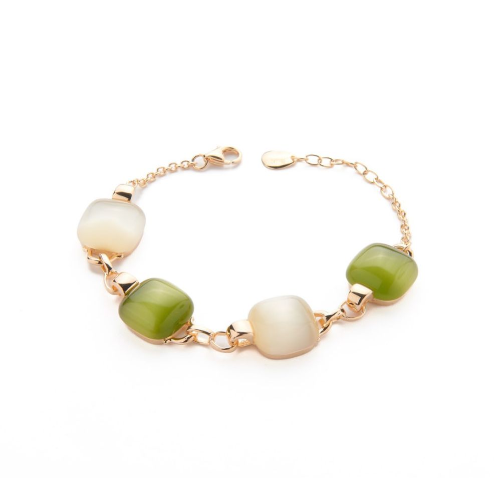 Il design si distingue per l’armonioso alternarsi di quattro quarzi idrotermali: due gemme in un vivido verde e due in una raffinata tonalità color avorio.