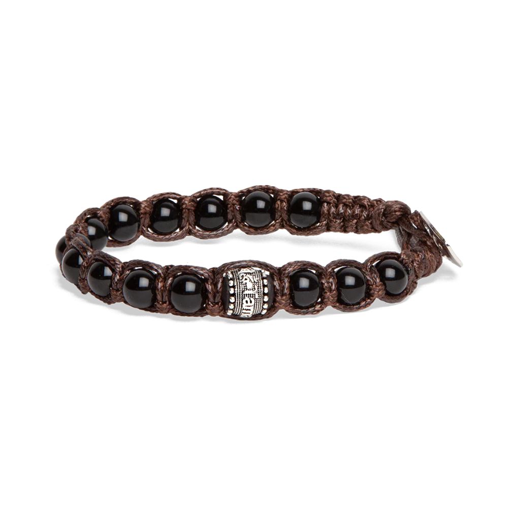 Bracciale unisex Tibetano Tamashii della linea Ruota della Preghiera, realizzato con pietre naturali di Onice e cordoncino marrone, benedetto dai monaci buddisti.