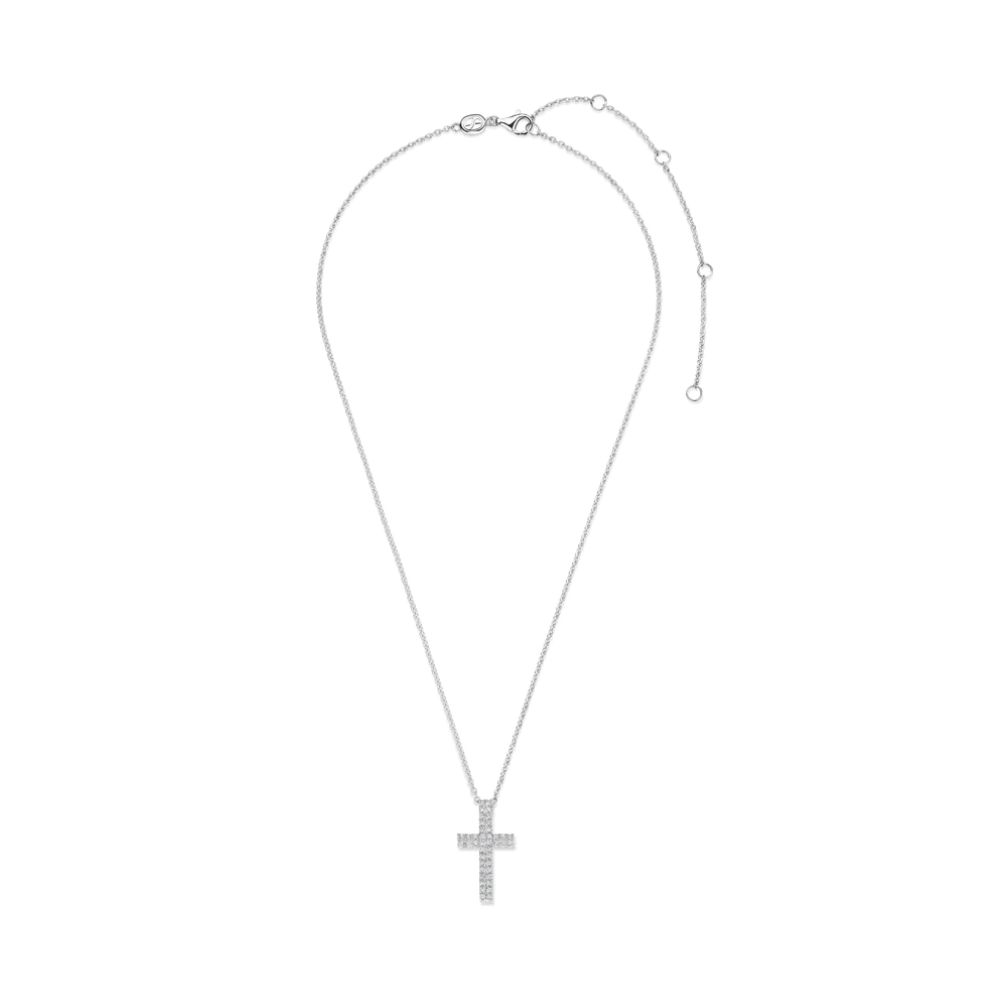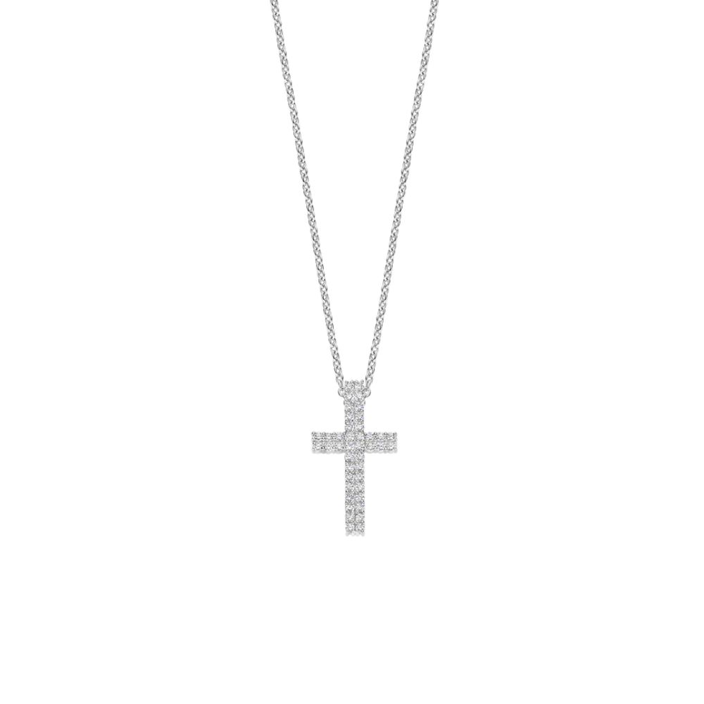 Pendente a forma di croce interamente impreziosito da un pavé di zirconi bianchi taglio brillante.