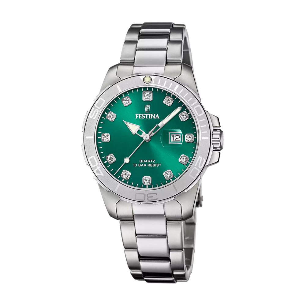 Festina Uhr mit Datumsanzeige aus Edelstahl und grünem Zifferblatt.