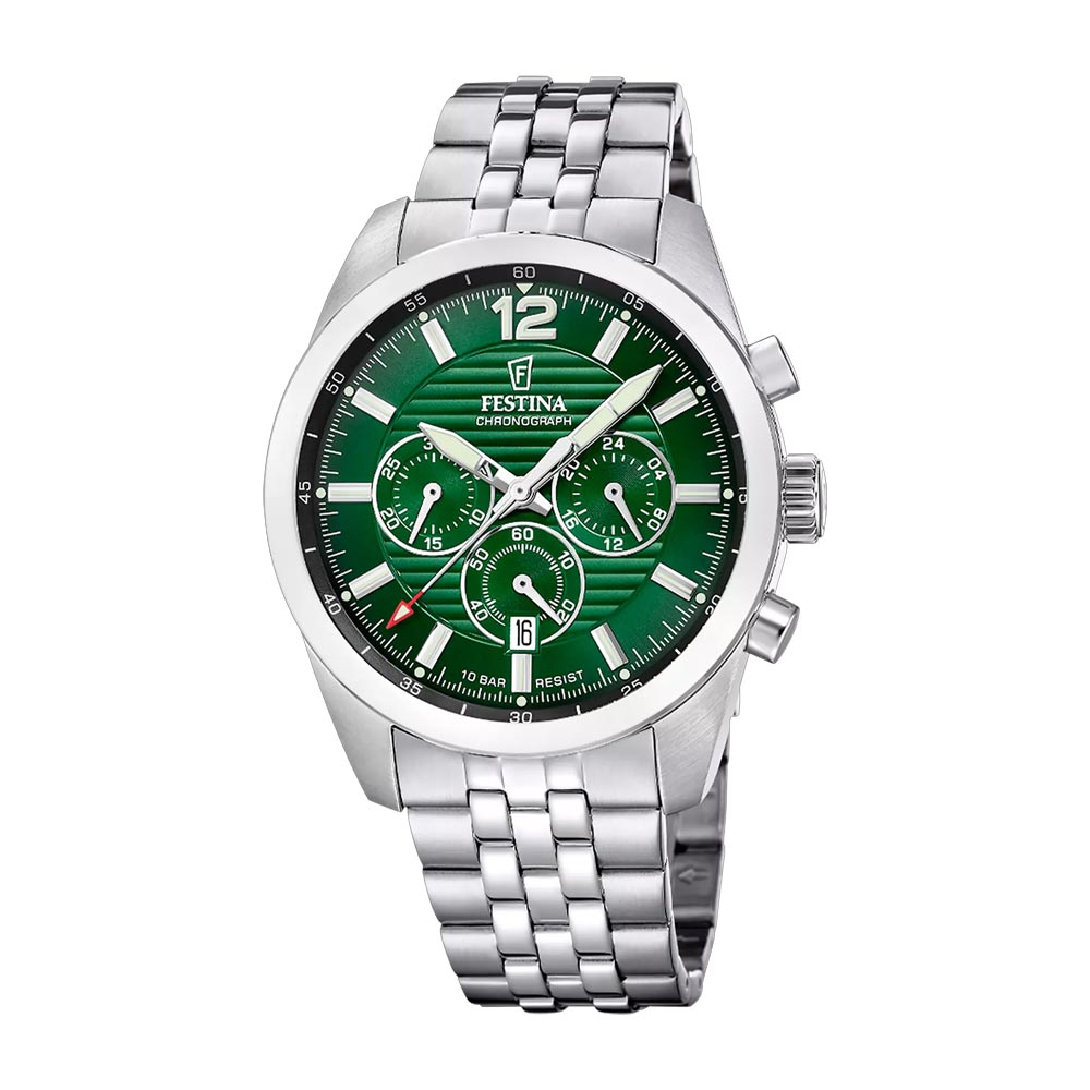 Green dial with six hands, protected by mineral crystal and enhanced by chronograph and date display.