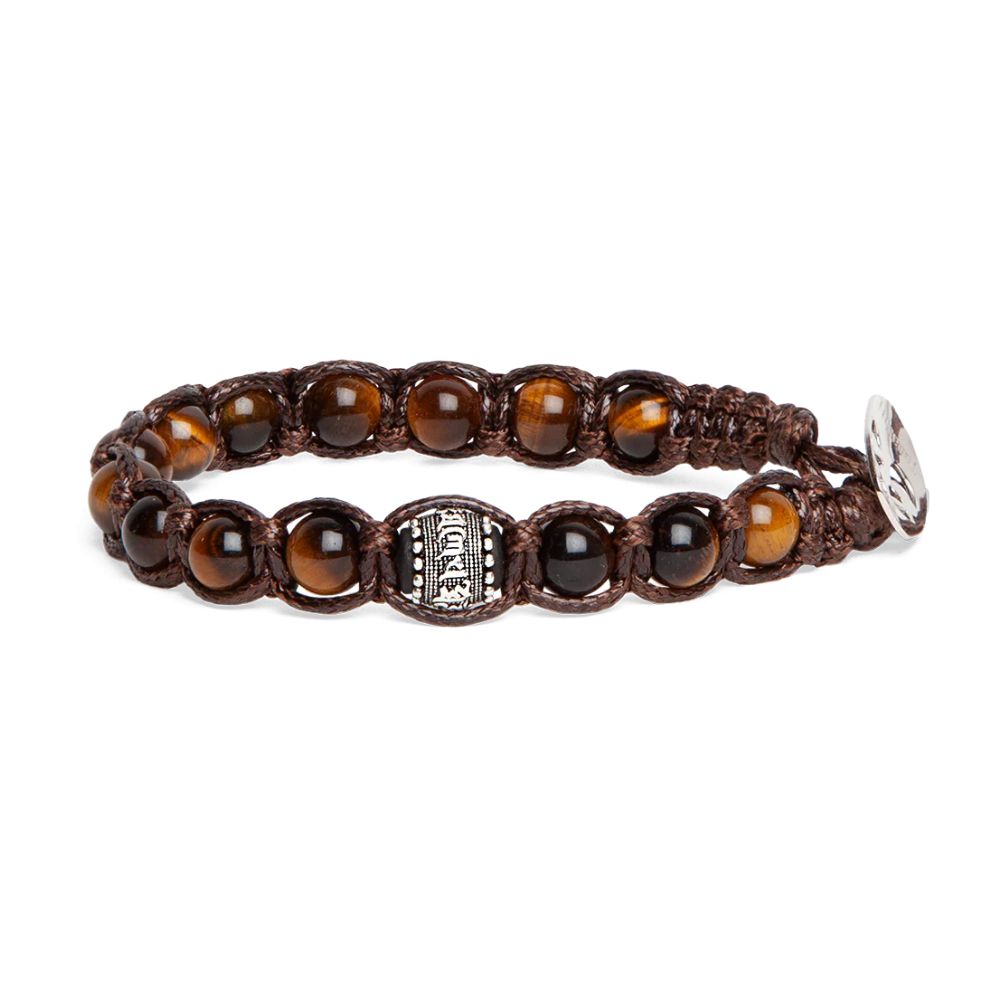 Unisex Tamashii bracelet from the Wheel of Prayer line, made with natural Tiger Eye stones and brown cord, blessed by Buddhist monks.
