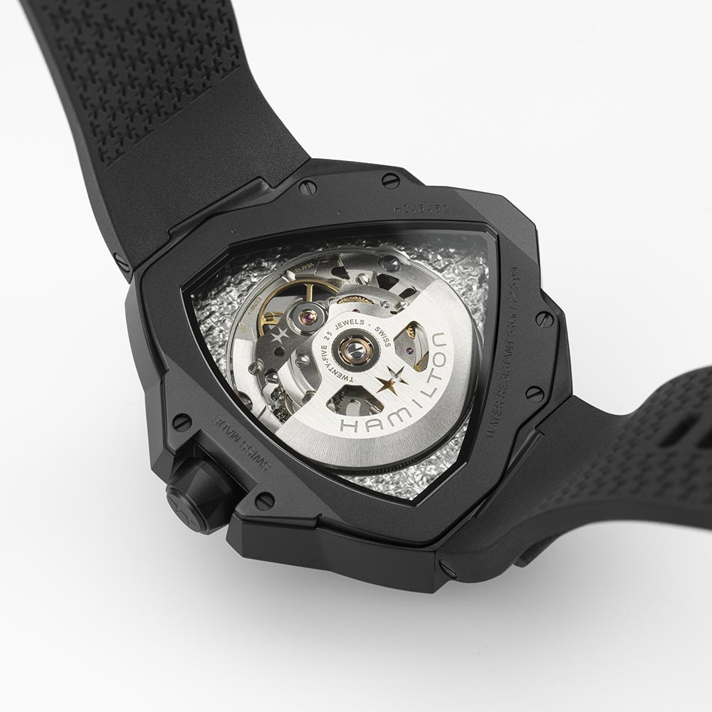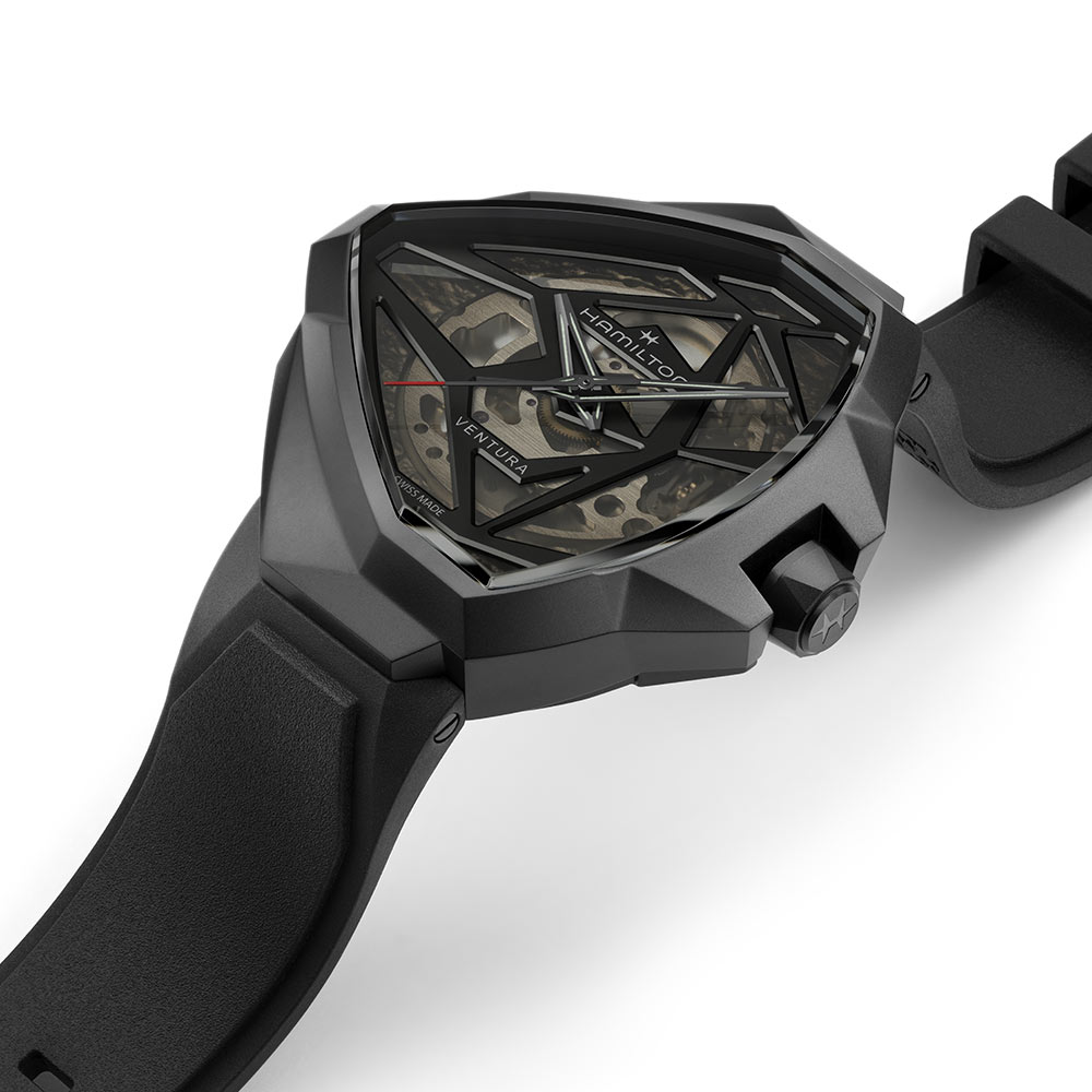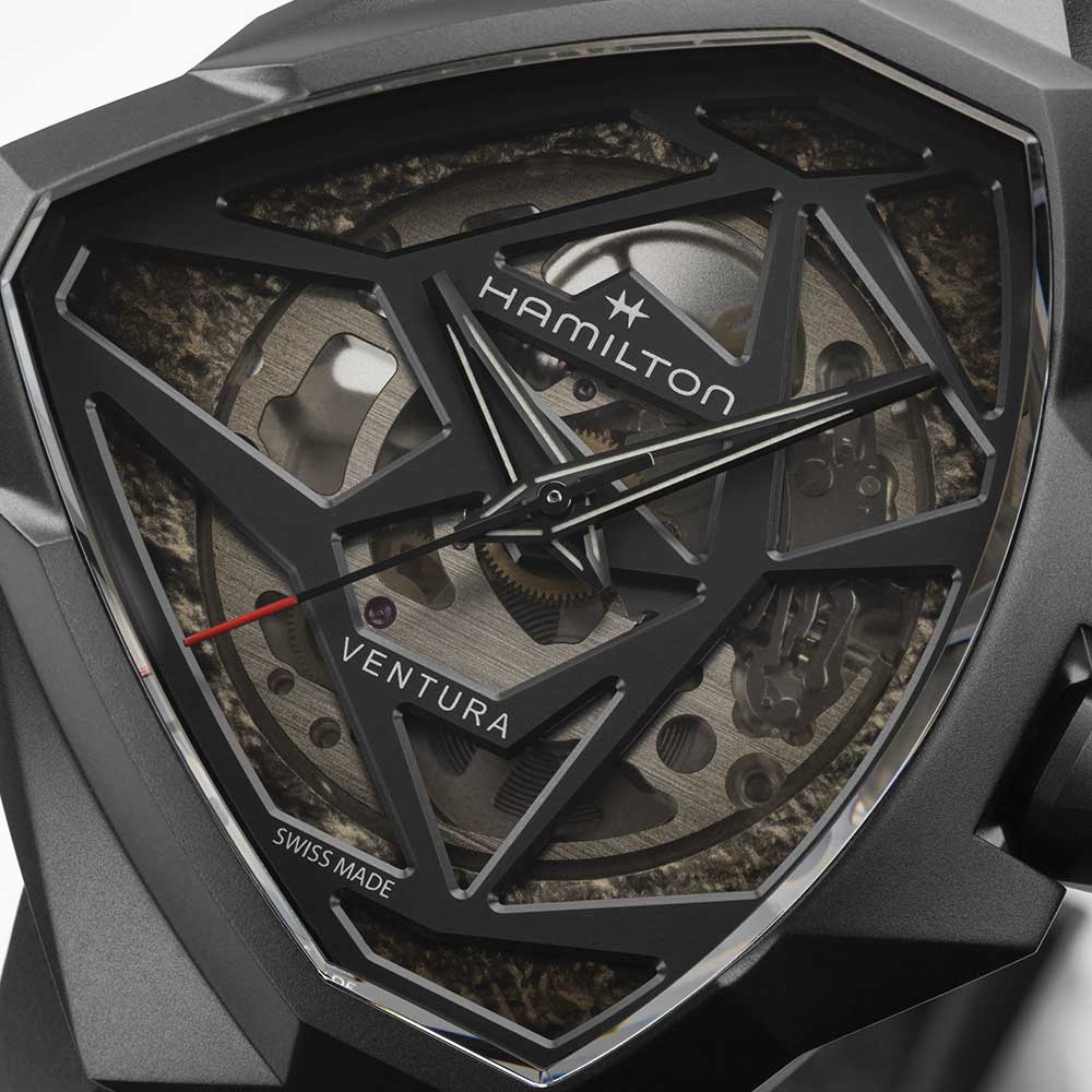 Hamilton Ventura Edge Skeleton H24645330 con calibro H-10-S e con movimento a carica automatica con riserva di carica di circa 80 ore.