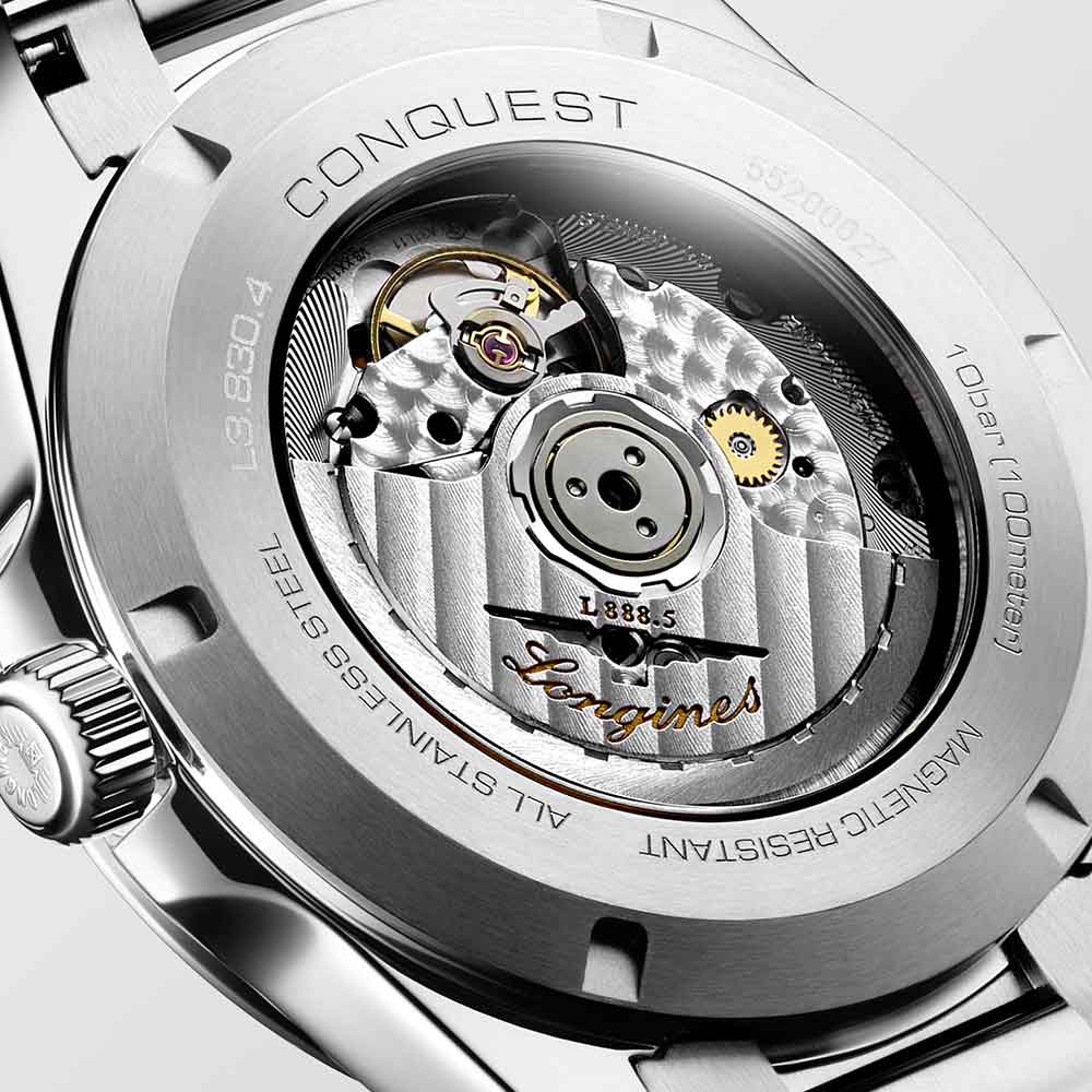 Orologio con movimento meccanico a carica automatica. Calibro Longines L888, 25.200 alternanze orarie, circa 72 ore di riserva di carica. Funzioni data, ore, minuti, secondi.