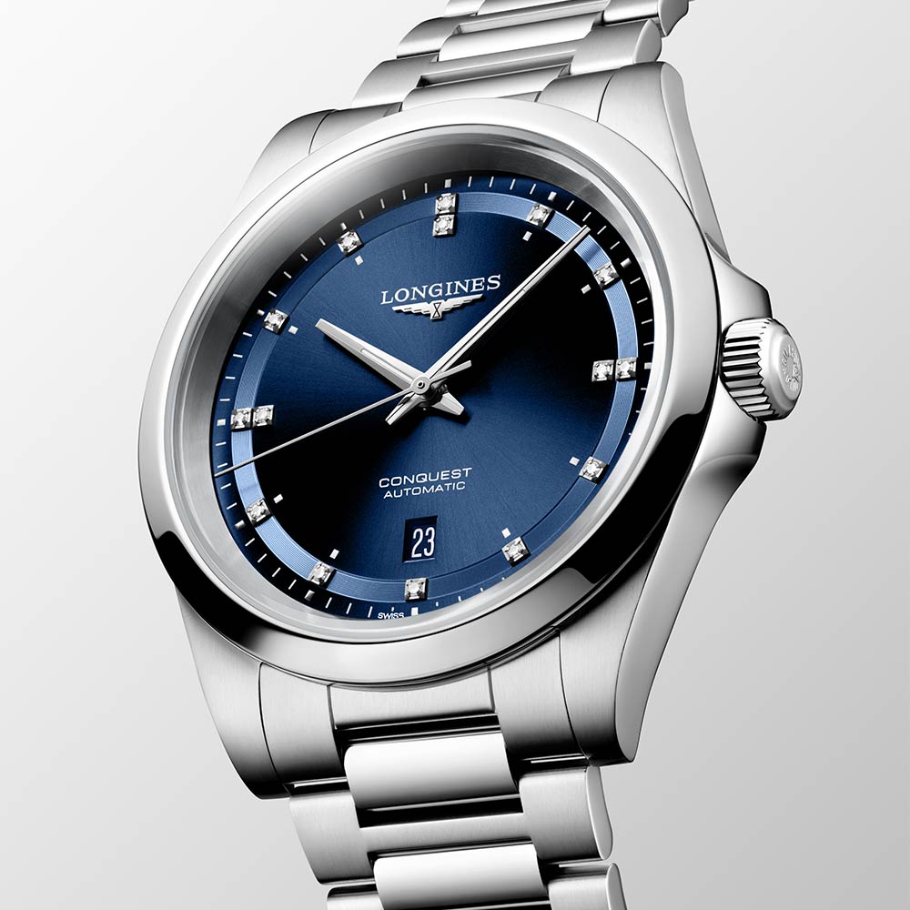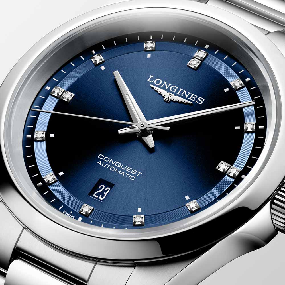 Quadrante a raggi blu, con lancette lucide argentate trattate per la visione al buio. Datario a ore 6. Sono incastonati 15 diamanti colore G e purezza VS2.