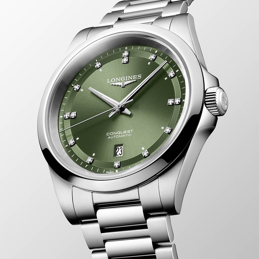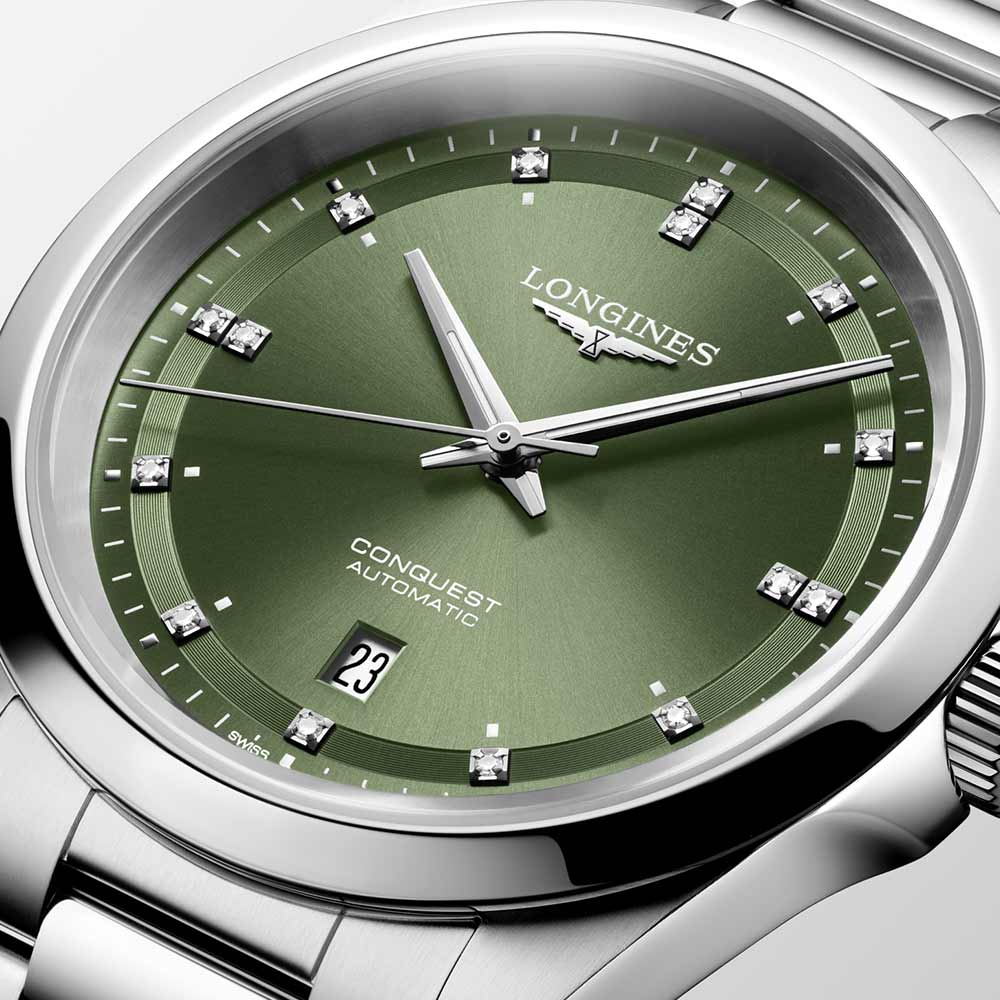Quadrante a raggi verde, con lancette lucide argentate trattate per la visione al buio. Datario a ore 6. Sono incastonati 15 diamanti colore G e purezza VS2.